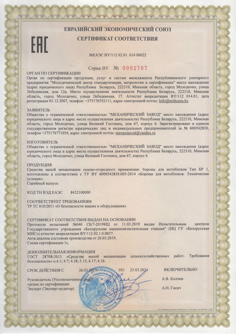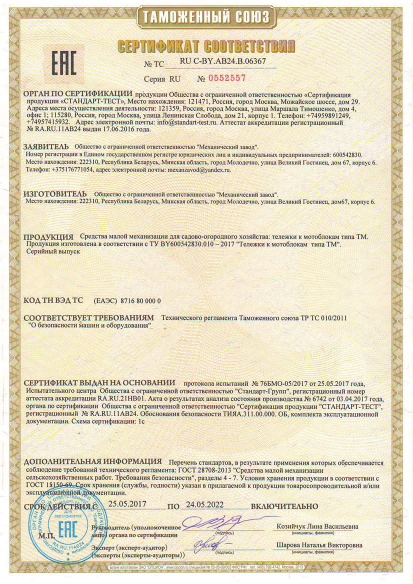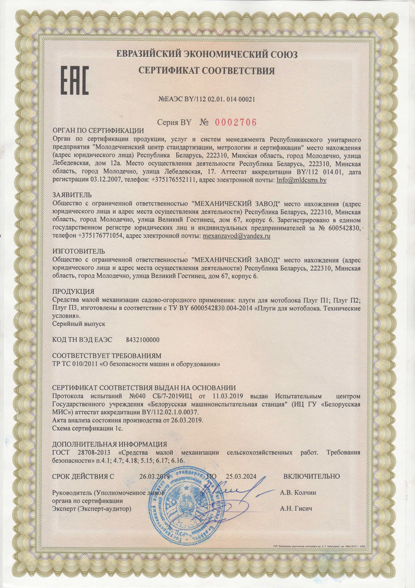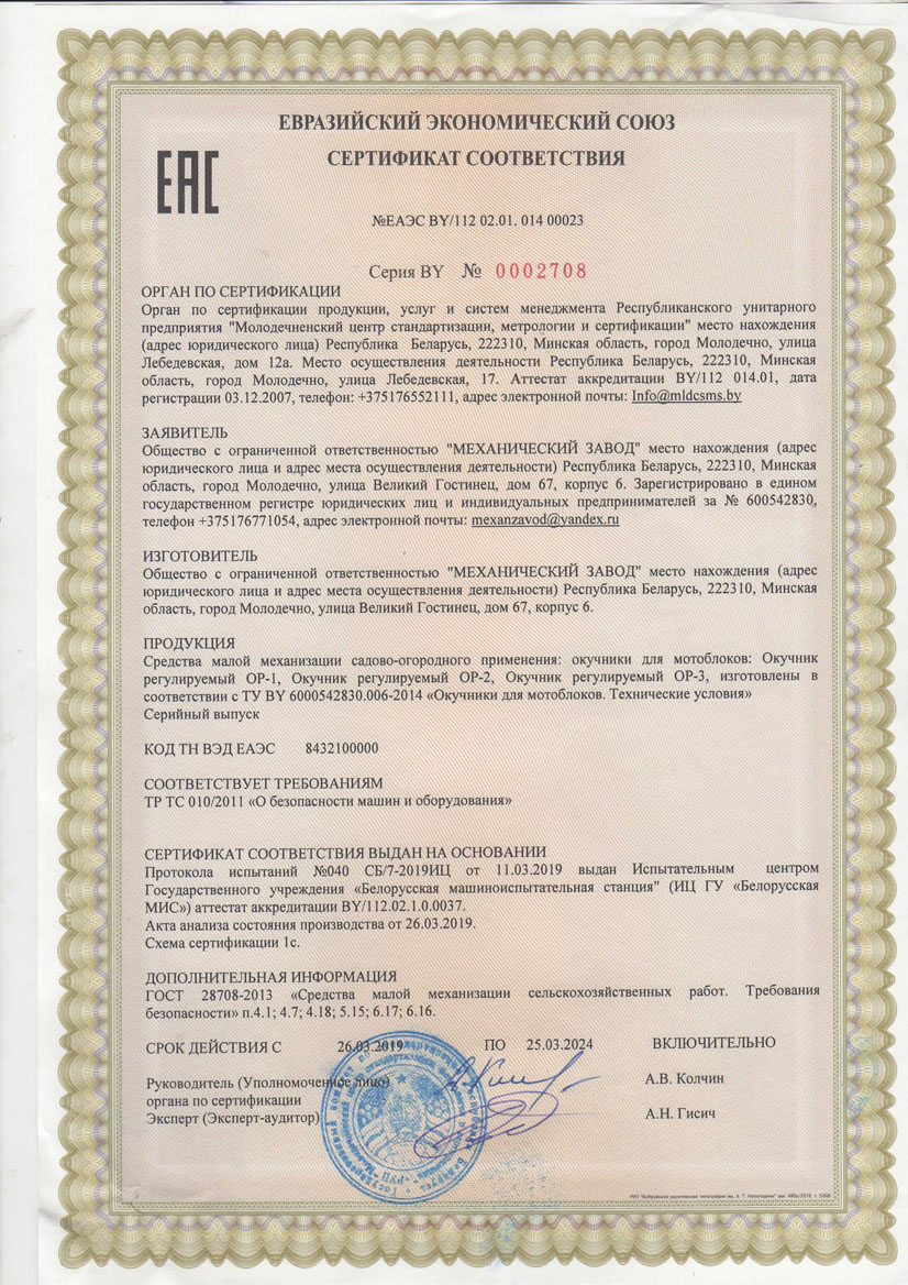 Сертификаты Приложение к сертификату на продукцию собственного производства 1 Сертификат соответствия Таможенного союза на тележки к мотоблокам типа ТМ Приложение к сертификату на продукцию собственного производства 2 Приложение к сертификату на продукцию собственного производства 3 Приложение к свидетельству на товарный знак Свидетельство на товарный знак Сертификат соответствия на бороны для мотоблоков бороны типа БР 1 Сертификат соответствия на окучники для мотоблоков окучник регулируемый ОР Сертификат соответствия на плуги для мотоблока плуги типа П1, П2, П3 Свидетельство о государственной регистрации Сертификат соответствия на картофелекопалку для мотоблоков, модели КМ. Серийный выпуск. О принадлежности к объектам обязательного подтверждения соответствия продукции "Адаптер для мотоблоков модели АМ" Сертификат соответствия на картофелесажалку модели КСМ Свидетельство о технической компетентности 1 Свидетельство о технической компетентности 2 Сертификат соответствия на мотокультиватор модели МК9 Сертификат на продукцию собственного производства