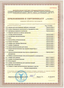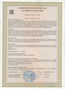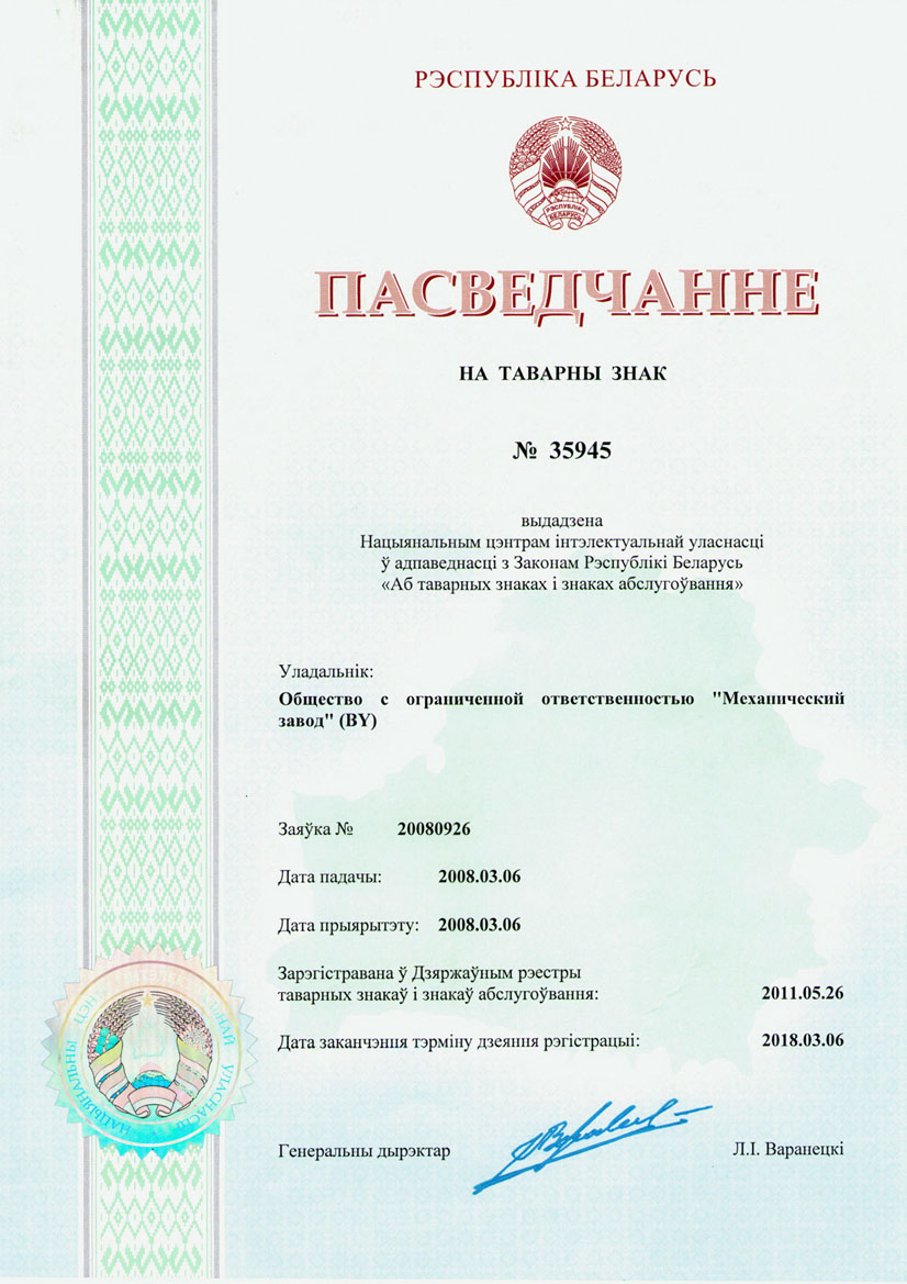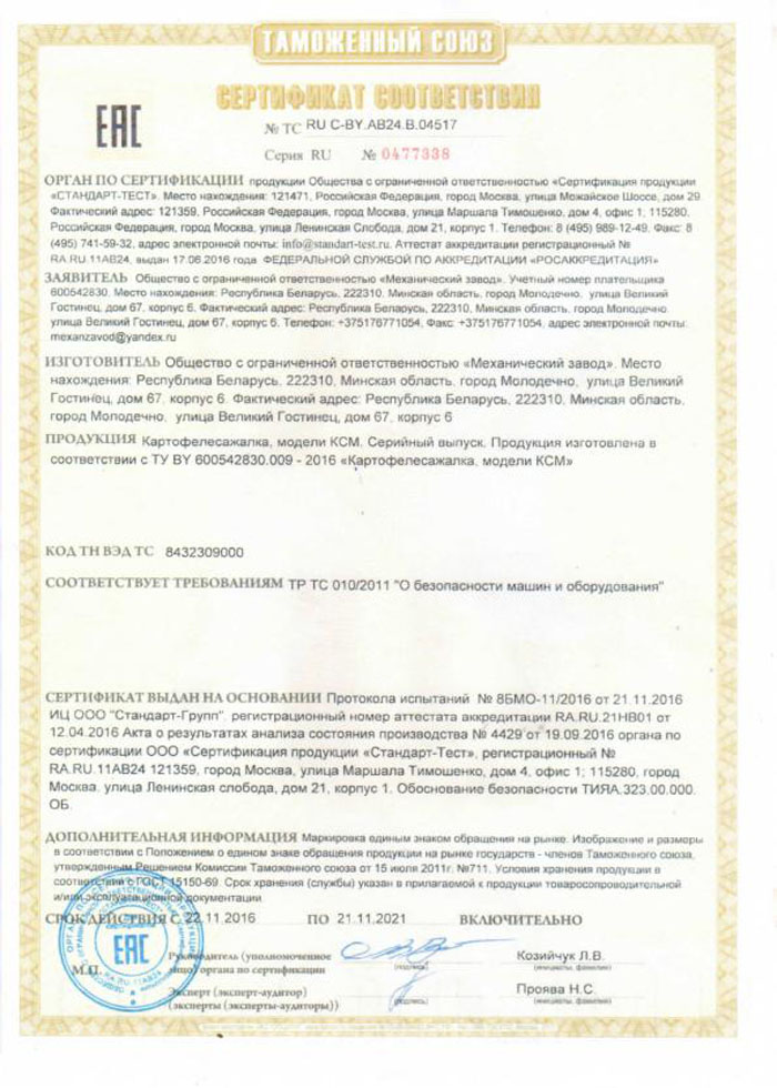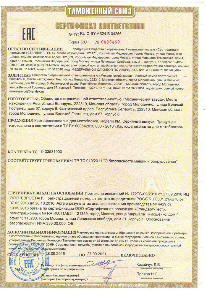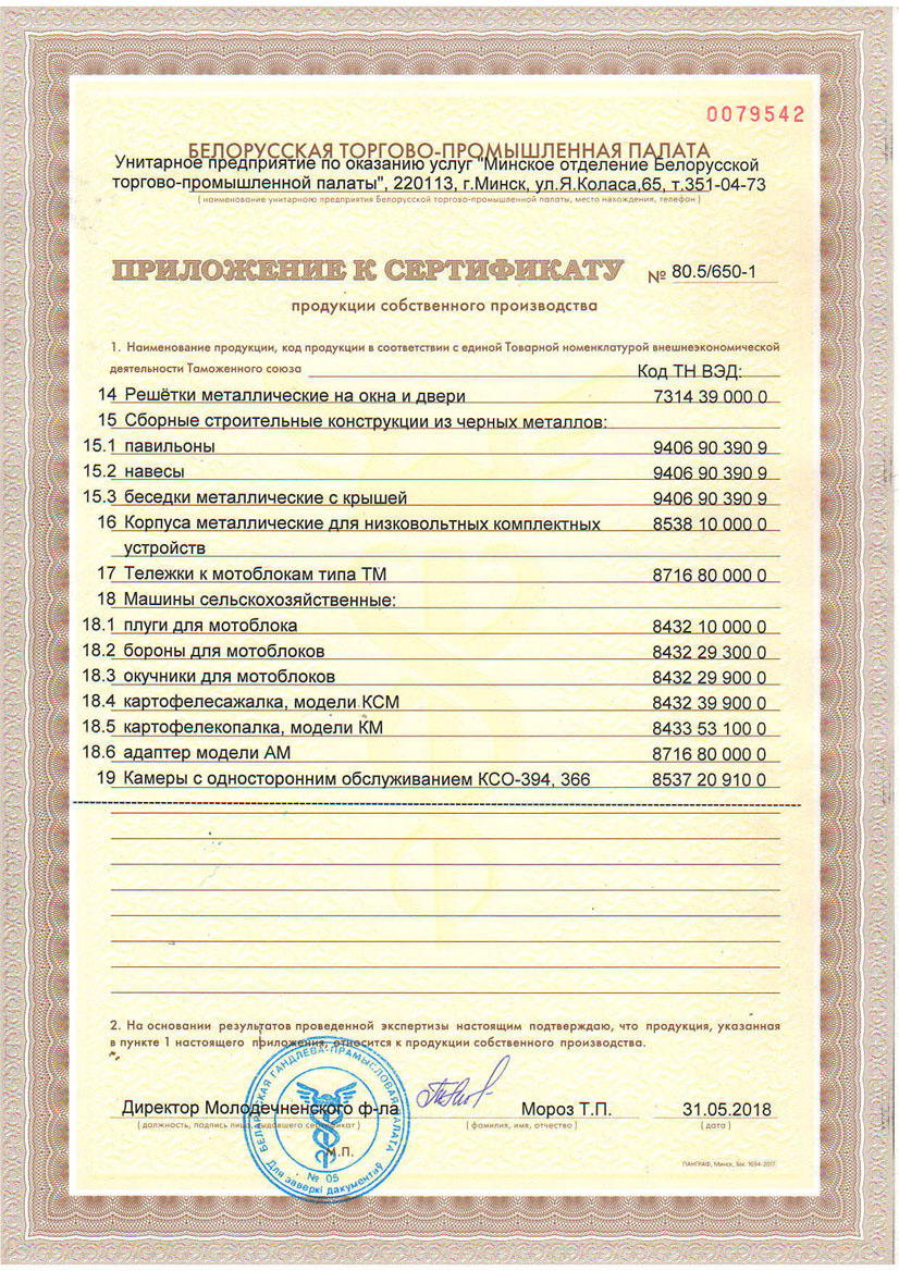 Сертификаты Приложение к сертификату на продукцию собственного производства 1 Сертификат соответствия Таможенного союза на тележки к мотоблокам типа ТМ Приложение к сертификату на продукцию собственного производства 2 Приложение к сертификату на продукцию собственного производства 3 Приложение к свидетельству на товарный знак Свидетельство на товарный знак Сертификат соответствия на бороны для мотоблоков бороны типа БР 1 Сертификат соответствия на окучники для мотоблоков окучник регулируемый ОР Сертификат соответствия на плуги для мотоблока плуги типа П1, П2, П3 Свидетельство о государственной регистрации Сертификат соответствия на картофелекопалку для мотоблоков, модели КМ. Серийный выпуск. О принадлежности к объектам обязательного подтверждения соответствия продукции "Адаптер для мотоблоков модели АМ" Сертификат соответствия на картофелесажалку модели КСМ Свидетельство о технической компетентности 1 Свидетельство о технической компетентности 2 Сертификат соответствия на мотокультиватор модели МК9 Сертификат на продукцию собственного производства
